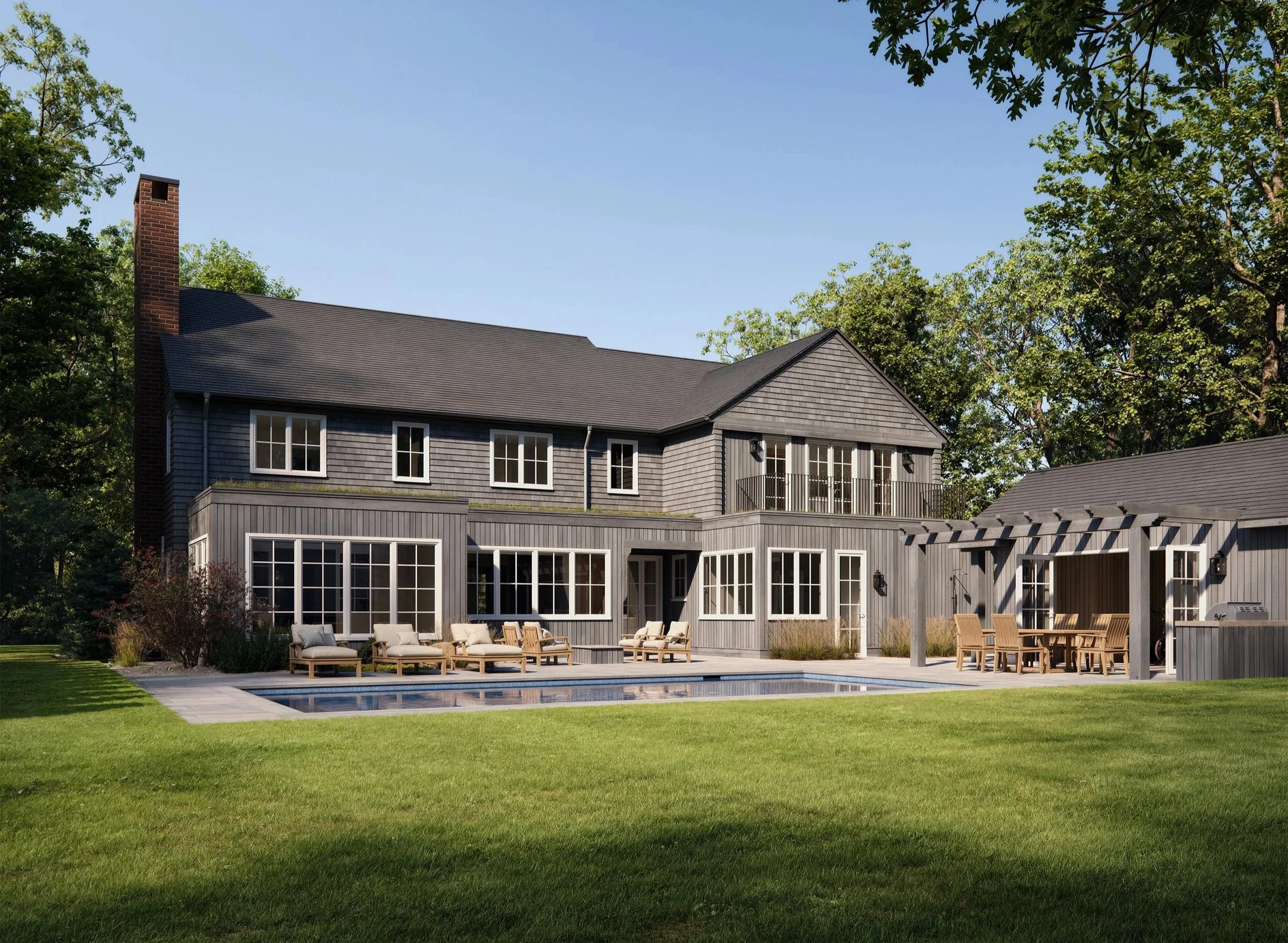 The backyard extends that same sense of ease, with a saltwater pool, outdoor shower, wellness suite, and south-facing yard. From sauna mornings to cold plunges and evenings spent barefoot by the water, the spaces are designed to be part of everyday living.