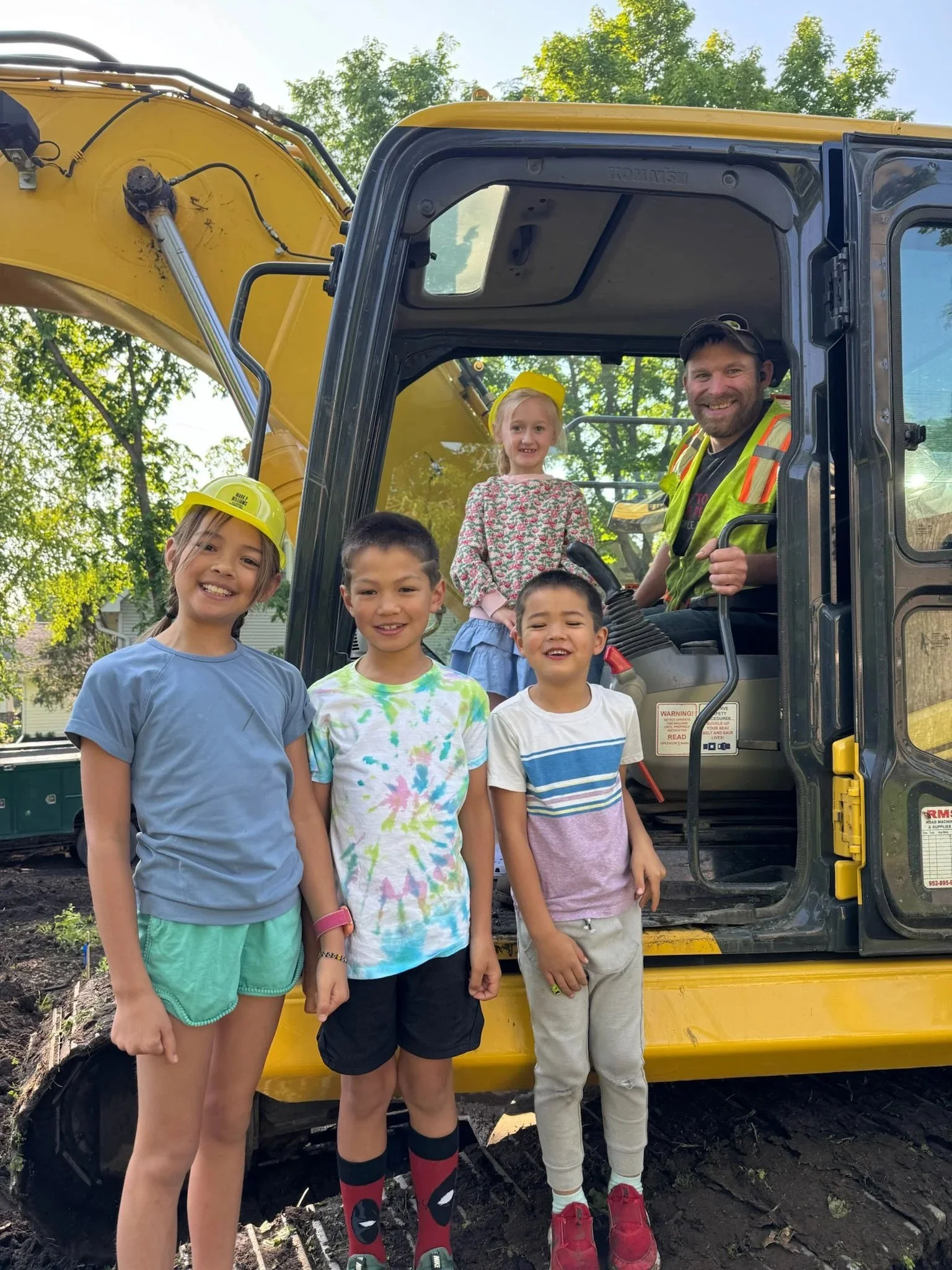 We didn’t want the groundbreaking to feel like a custom home building ceremony with hard hats and gold shovels. That’s not our style. We wanted it to feel real and approachable. I brought my kids—Mae, Simon, and Tate. Melissa, the designer, brought her daughter. A past client we remodeled for came out with their kids too. We sent a heads-up to the neighbors and posted a quick invite on Instagram. A few folks walked over to check it out, ride the excavator, take some photos, and be part of the moment.